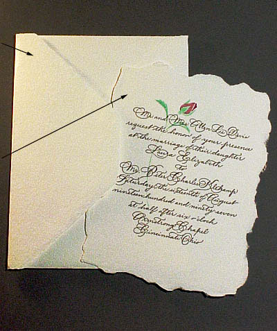 | Rectangular Heavyweight Card with Feather Deckled Edge (Item #28) (Example of letterpress printing from calligraphy by Holly Monroe with hand-painted flower) |
